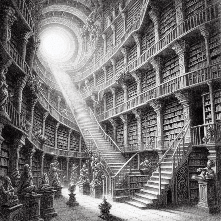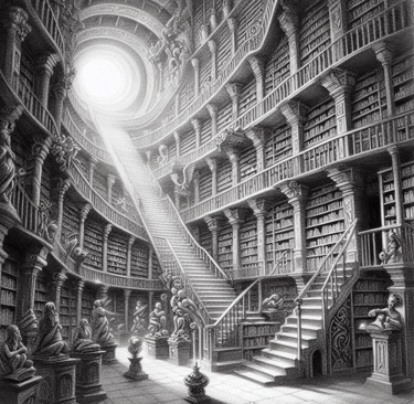 En esta imagen del post, podemos ver la espiral desde donde se viene expandiendo la Biblioteca de Babel. Esta idea, es muy natural y recurrente en la mente humana: el registro de todo lo que se ha vivido, escondido en alguna parte de nuestro universo o universos. Puede ser que cuando pasemos al otro lado (de la vida), podamos recorrer las historias del origen del universo, y el registro de cada estrella, galaxia, planeta, meteorito, bólido, asteroide, polvo estelar, y tantos eventos que acontecen en este "eterno" espacio tiempo. ¿Puede ser que una tecnología como la detección de ondas gravitacionales pueda decirnos cosas de este tipo?, al parecer sí, así que, ya veremos hasta donde llegamos...